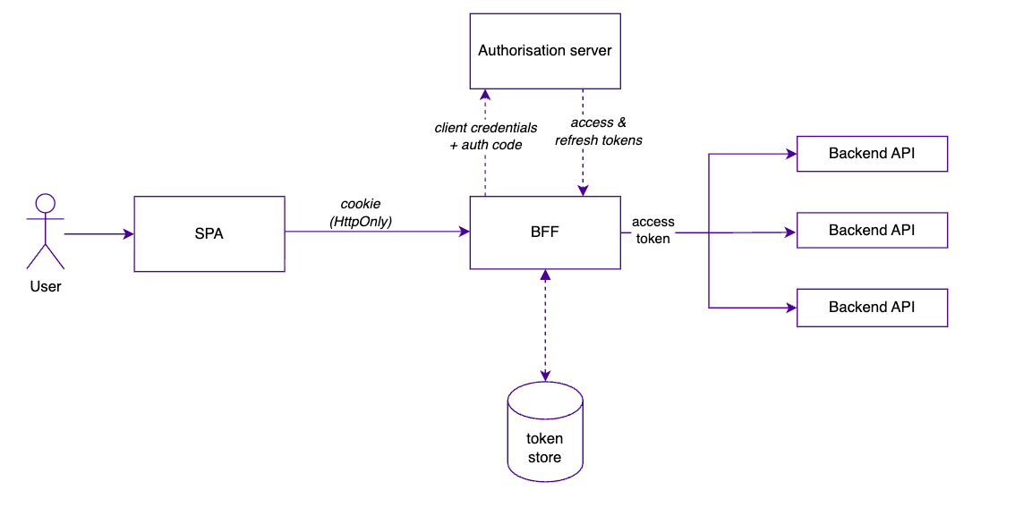 • How it works: You still use a backend component to handle the OAuth exchange (exchanging the authorisation code for tokens), acting as a confidential client. However, instead of keeping the access token hidden, the backend passes it to the browser application. The browser then uses this token to call resource servers directly.